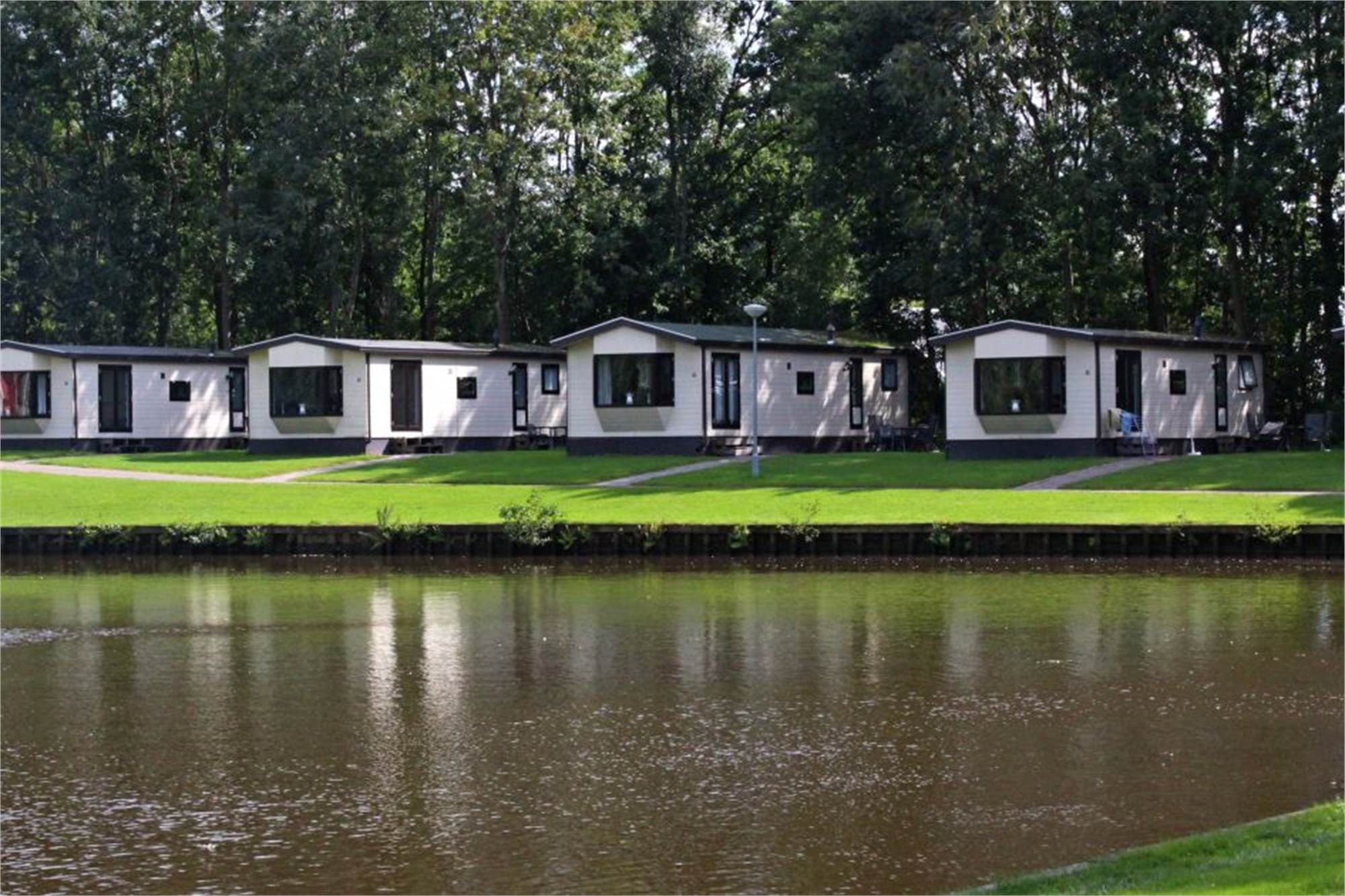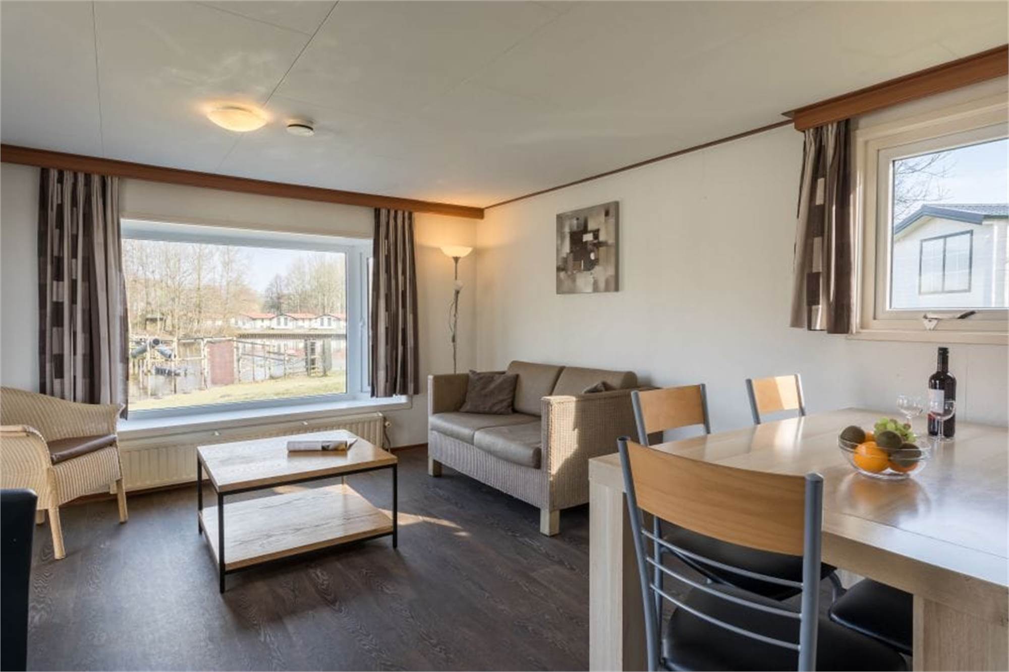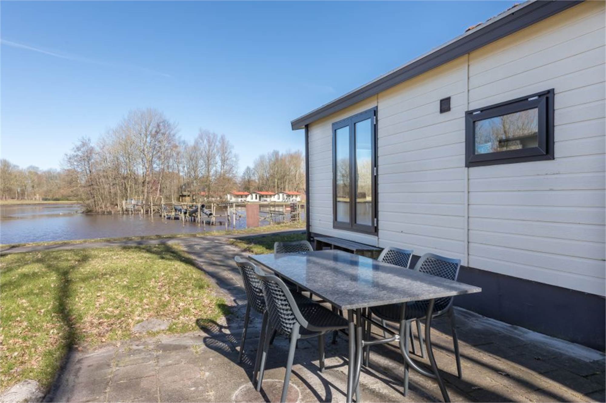 This detached chalet is one-level and suitable for 5 persons. The chalet has a living room with television and an open kitchen with microwave, fridge and coffee machine. There are 2 bedrooms, 1 of which with 2 single beds and 1 with a bunkbed and 1 single bed. The chalet has a bathroom with shower and toilet, and is in addition provided with a furnished terrace. A car park is near the accommodation and use of Wi-Fi is free of charge.