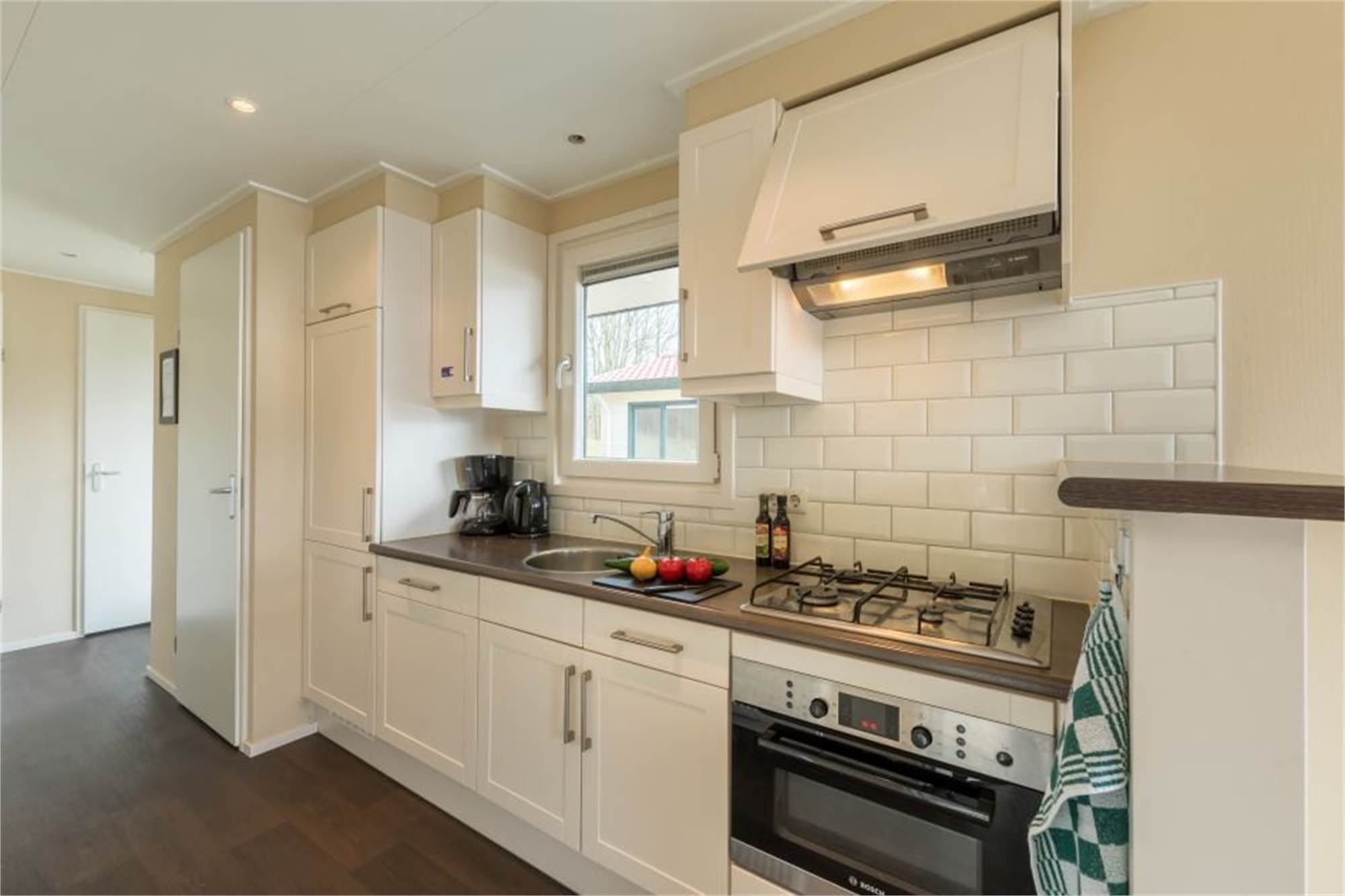 This detached chalet is one-level and suitable for 6 persons. The chalet has a living room and an open kitchen with microwave oven, fridge/freezer, dishwasher and coffee machine. There are 3 bedrooms, 1 of which with 2 single box spring beds and 2 with a bunkbed. The chalet has a bathroom with shower and toilet, and is in addition provided with a furnished terrace. Use of Wi-Fi is free of charge.