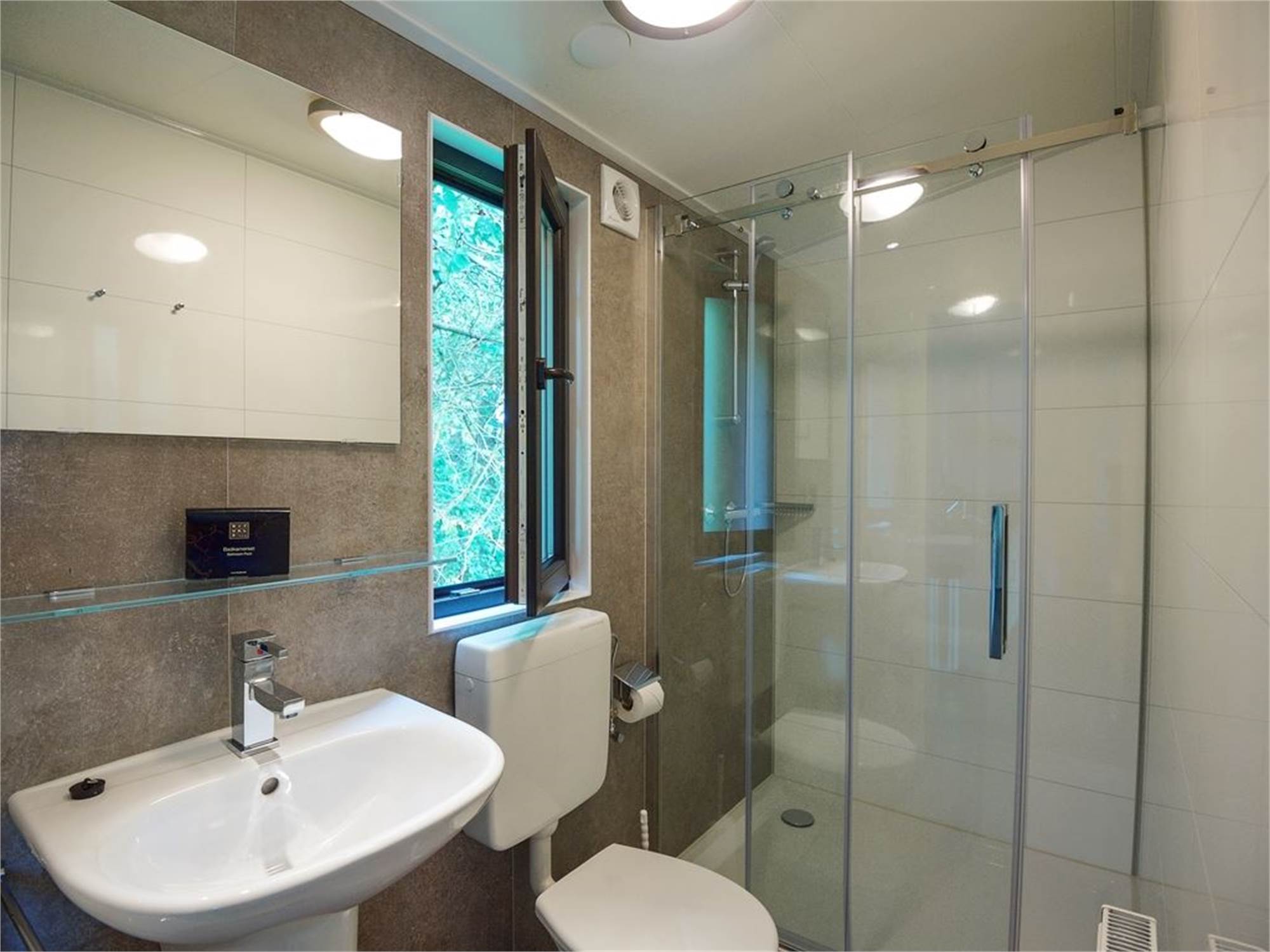Bathroom with shower cubicle, washbasin and toilet